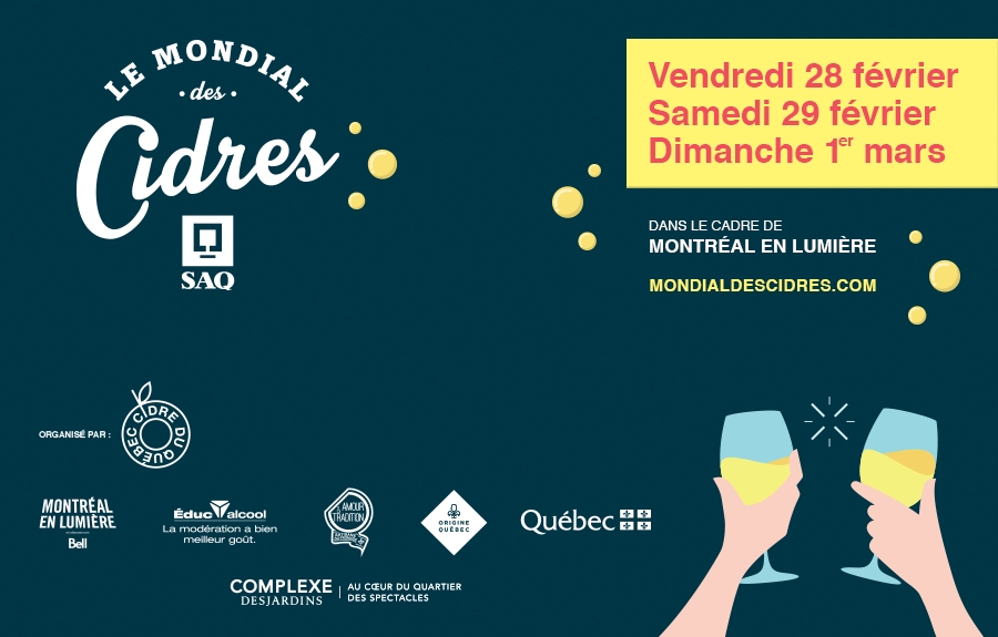 Le Mondial des Cidres SAQ est de retour pour une 13e édition qui se tiendra du 28 février au 1er mars à la Grande-Place du complexe Desjardins de Montréal, au cœur du Quartier des Spectacles. Présenté par la Société des alcools du Québec et chapeauté par Cidre du Québec dans le cadre de MONTRÉAL EN LUMIÈRE, l’événement sera l’occasion idéale de découvrir le cidre sous toutes ses déclinaisons – de glace, effervescent, de feu, rosé et tranquille – et ses nombreux accords gourmands.