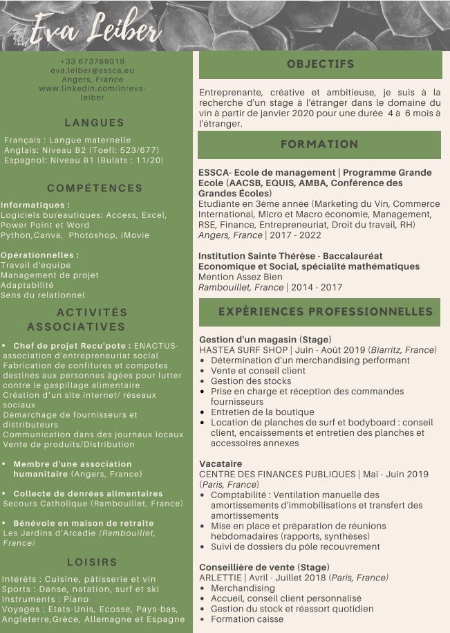 Ouverte d'esprit et polyvalente, je souhaite me diriger vers le secteur du vin en intégrant un double diplôme Commerce International et Œnologie dès l'année prochaine. Ainsi, je désire bénéficier d' une première expérience professionnelle dans ce domaine dès aujourd'hui, sachant que j'ai acquis certaines compétences via mes études (marketing du vin, diagnostic export pour la Maison de Champagne Duval-Leroy).