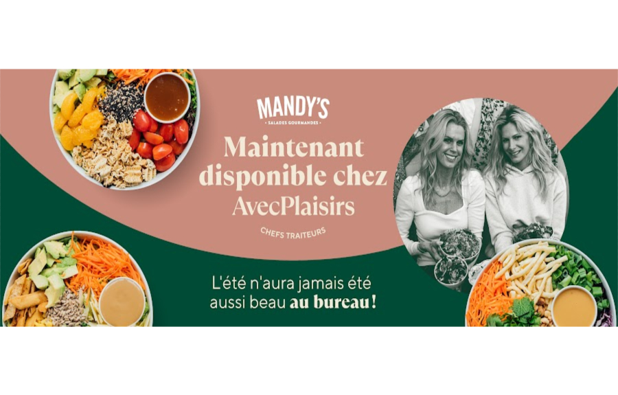 AvecPlaisirs Chefs Traiteurs, reconnu pour ses collaborations avec des chefs renommés, est fier d'annoncer son nouveau partenariat avec Mandy’s, l'entreprise montréalaise célèbre pour ses salades innovantes et ses ingrédients de première qualité. Que ce soit pour des réunions d’affaires, lunchs d’équipe ou de cocktails dînatoires, les clients d’AvecPlaisirs pourront désormais commander les savoureuses salades Cobb, Wolfe, Bûcheron et bien d’autres. Les livraisons seront effectuées à l’heure précise, grâce à une technologie avancée de logistique et de géolocalisation développée par AvecPlaisirs Chefs Traiteurs.