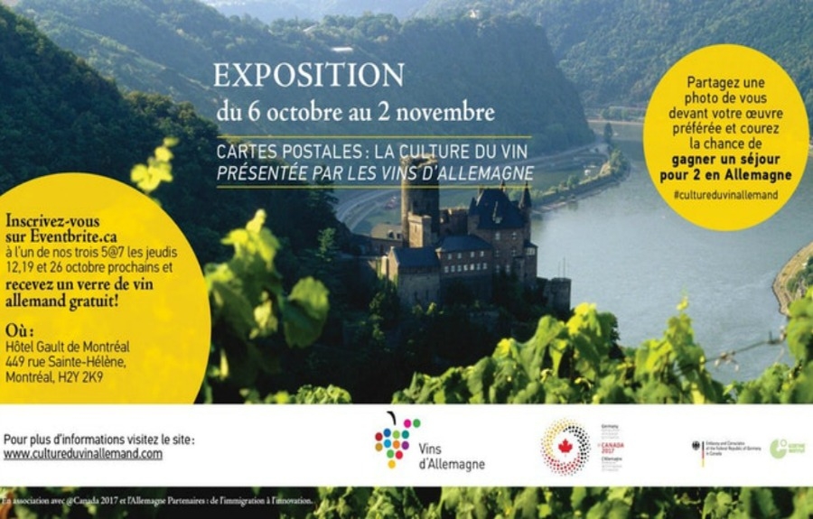 À l'occasion du 150e anniversaire de la Confédération et du 375e anniversaire de Montréal, Vins d'Allemagne offre au public montréalais l'occasion de découvrir, en primeur internationale, l'exposition photo Cartes postales : La culture du vin, qui documente l'histoire et la tradition du vin allemand. Le public est invité à découvrir gratuitement l'exposition Cartes postales : La culture du vin dans le hall et la bibliothèque de l'hôtel Gault, du 5 octobre au 2 novembre prochain.