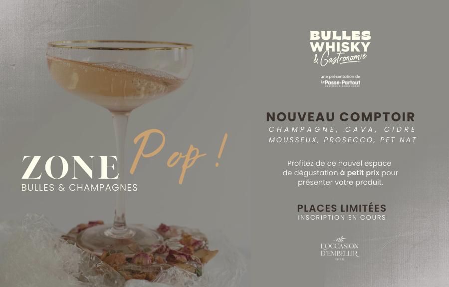 L’objectif de la zone Pop est de permettre aux producteurs et aux agences n’ayant qu’un seul, ou jusqu’à trois produits, de minimiser leur travail de préparation et leur coût. L’espace comprend un bar de 4 pieds, ainsi que l’entièreté de la décoration. Il ne vous faut qu’un(e) ambassadeur(-rice) et les produits à présenter.