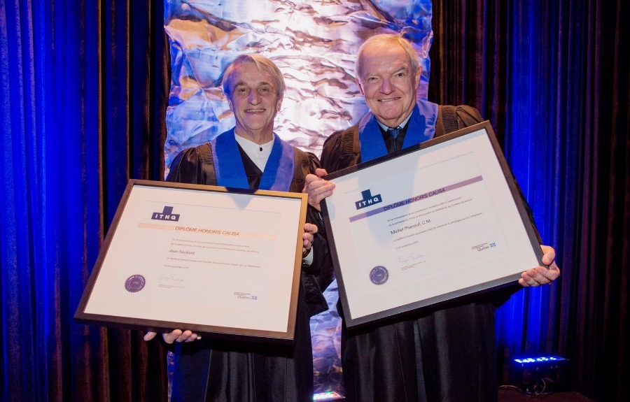 L'Institut de tourisme et d'hôtellerie du Québec (ITHQ) a honoré hier deux personnalités pour leur contribution exceptionnelle à la sommellerie et à la restauration québécoises. Il s'agit de Michel Phaneuf, auteur pendant 30 ans du célèbre Guide du vin, et Jean Soulard, chef cuisinier bien connu. Tous deux ont reçu un diplôme honoris causa de l'ITHQ, que l'honorable Liza Frulla, C.P., C.M., O.Q., directrice générale, et M. Paolo Di Pietrantonio, président du conseil d'administration, leur ont remis hier, lors d'une cérémonie au Palais des congrès de Montréal.