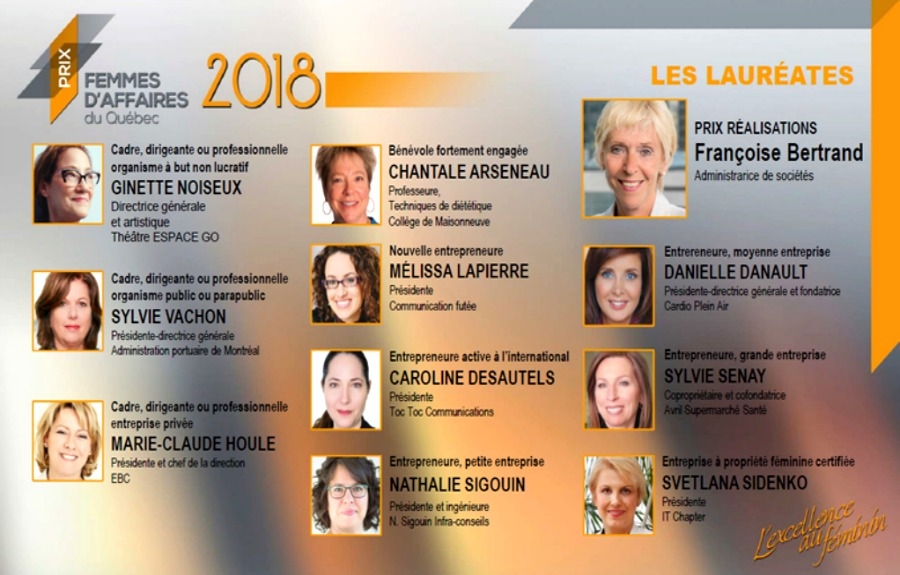 Le Réseau des Femmes d’affaires du Québec, en collaboration avec le Gouvernement du Québec, Nelly De Vuyst, Téléfilm Canada et Vidéotron Affaires, présentait ce soir le 18e gala Prix Femmes d’affaires du Québec. Sous les applaudissements nourris de plus de 1000 femmes et hommes d’affaires les lauréates ont été dévoilées.