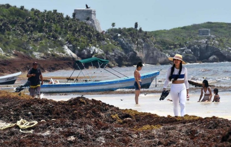 Sur la plage mexicaine de Tulum, un bateau repose sur une épaisse couche nauséabonde dont la couleur brune éclipse totalement le sable étincelant qui fait la réputation mondiale de la côte caraïbe.