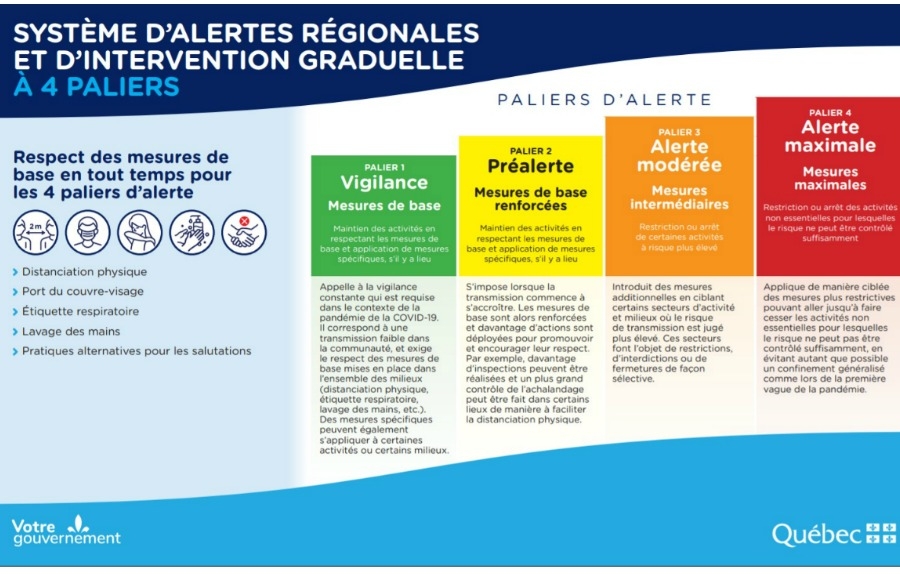 Vert, jaune, orange et rouge. Christian Dubé, le ministre de la Santé, a présenté ce matin le nouveau système d'alertes régionales à quatre paliers qui permettra de guider les actions et les décisions du gouvernement en matière de lutte et de prévention de la COVID-19. Les régions du Québec sont désormais classées selon un code de couleurs qui permettra une modulation des normes sanitaires (voir carte).