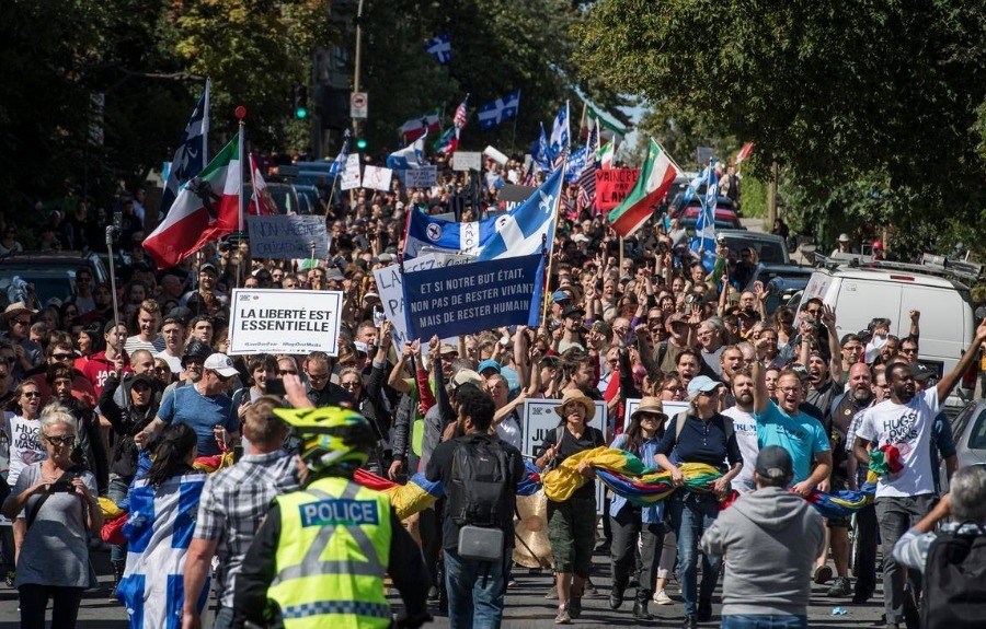 Plusieurs milliers de personnes ont défilé à visage découvert dans les rues de Montréal samedi scandant des slogans et chantant à tue-tête sans respecter la distanciation sociale, alors que le bilan des infections de COVID-19 est toujours en hausse, ce qui inquiète les autorités.
