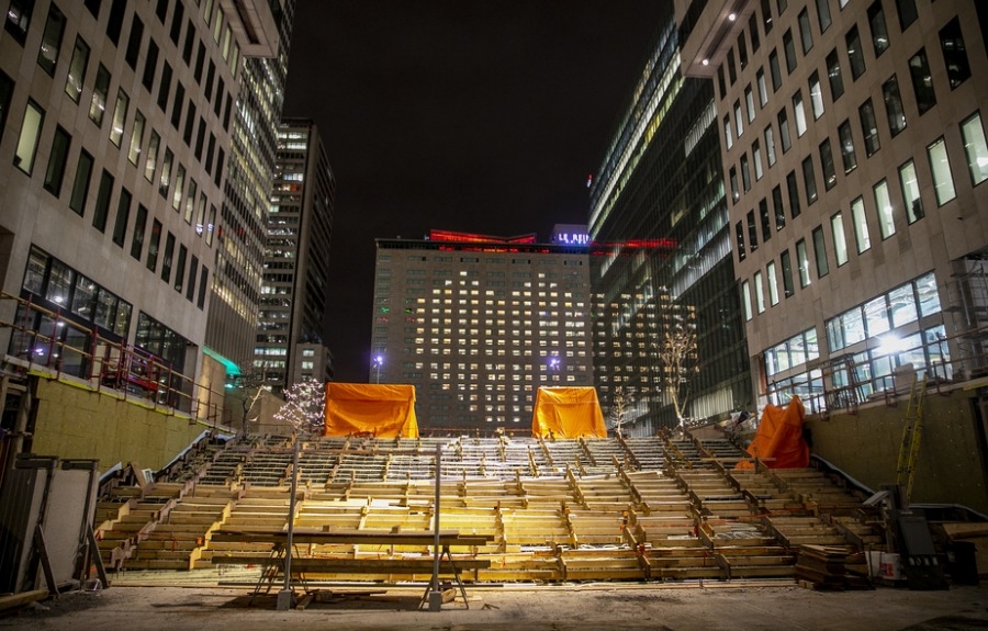 Claude Cormier, architecte à l’origine des boules multicolores du Village gai, a été mandaté par les propriétaires de Place Ville Marie pour travailler sur cet immense projet d’installation artistique, baptisée L’Anneau/The Ring. Il fait actuellement l’objet de consultations auprès des autorités municipales.