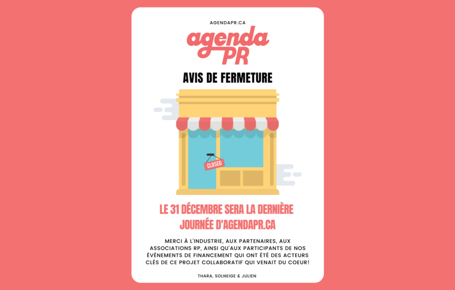On se plaît à dire qu'AgendaPR a été l'aventure entrepreneuriale la moins payante de notre vie. Nous avons cependant pu en tirer de belles rencontres et aussi retirer beaucoup de fierté à réussir avec seulement 3 paires de bras à donner accès à un outil pratique, des formations et des événements de réseautage à une industrie qui nous passionne. Merci à tous les participants, les panélistes et les animateurs des quatre éditions de la Journée de conférences AgendaPR, notre événement de financement annuel. Votre expertise, vos feedbacks et vos discussions entendues dans les panels et en coulisses nous faisaient remplir nos cahiers de notes pour constamment vouloir nous dépasser et élever l'industrie. Nous nous sommes donnés à 100% dans ce projet et votre reconnaissance nous a permis d’oublier les cernes qui se creusaient sous nos yeux à la fin de chacune des éditions! Un grand merci à nos partenaires et aux participants qui ont cru en nous et qui nous ont permis de financer les événements et l’outil durant toutes ces années. En terminant, nous soulignons que le premier répertoire de l'industrie des relations publiques Engageunrelationniste.com tirera également sa révérence. La plateforme qui était selon nous une si belle idée n’a malheureusement pas réussi à rallier l'industrie. En espérant vous recroiser dans un contexte plus joyeux à travers le merveilleux monde des comms! Thara, Solneige et Julien