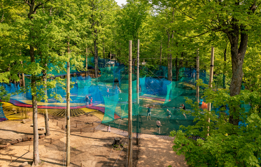 Le défi était de taille et le résultat l’est tout autant! Le design architectural de cordages qui s’entremêlent pour revêtir différentes formes est hors du commun. Devant cette imposante structure nouée, le visiteur est fasciné par son esthétisme. On croirait une œuvre d’art suspendue en pleine forêt! Voir autant de trampolines parmi les arbres, reliées pour former un village aérien, c’est comme rendre l’impossible possible! Inévitablement, enfants et adultes sont envoûtés par le décor.