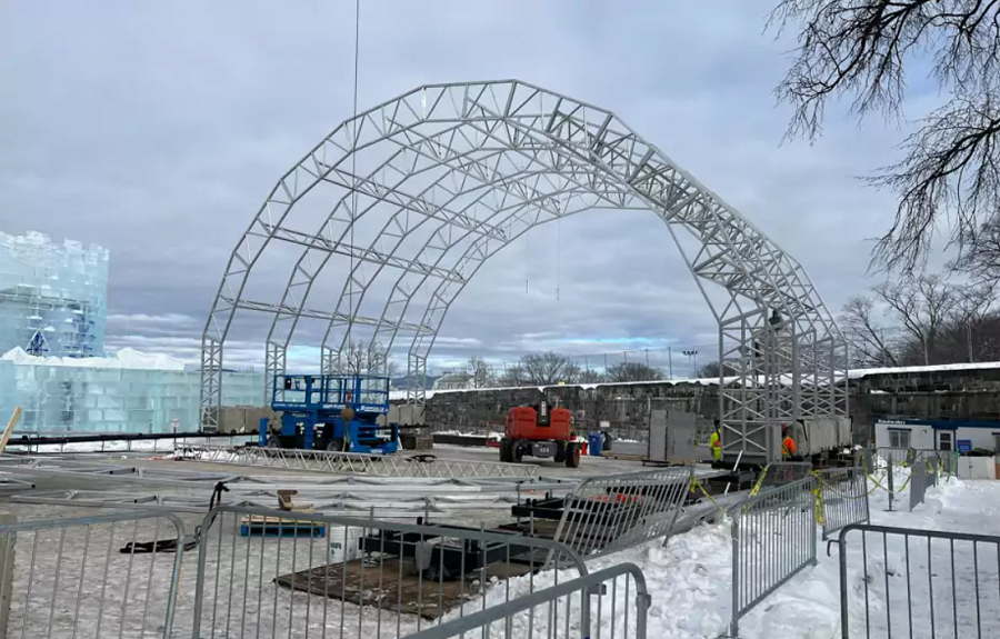 La structure conçue, fabriquée et installée par l’entreprise québécoise Unisson pour le Carnaval de Québec accueillera rassemblements et spectacles devant le parlement, dans la cour du Palais de Bonhomme. Son érection vient tout juste de s’achever.