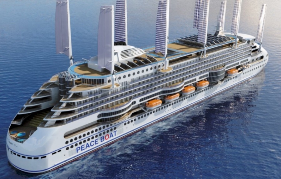 Il a fière allure avec sa dizaine d'éoliennes et de voiles photovoltaïques sur le pont, l'Ecoship de Peace Boat prend forme et devrait sillonner les mers du monde, en 2020.