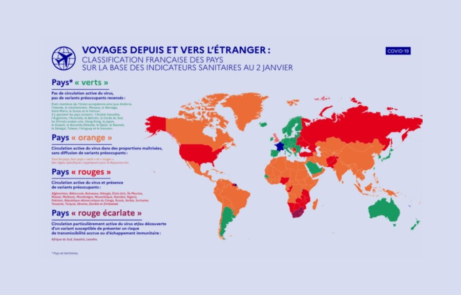 La France a modifié les conditions de voyage pour quelques destinations en vertu de l‘arrêté du 31 décembre 2021 modifiant l’arrêté du 7 juin 2021 identifiant les zones de circulation de l’infection du virus. Ces changements sont entrés en vigueur le dimanche 2 janvier.